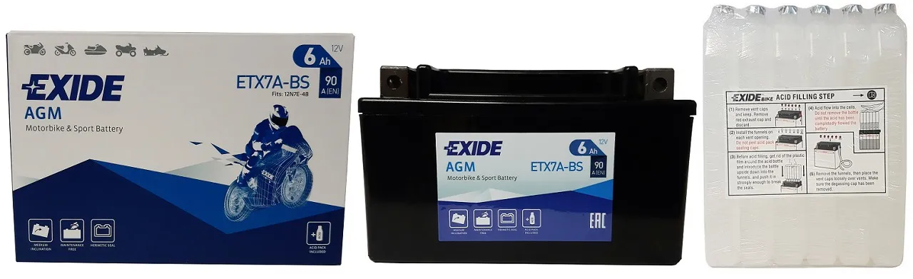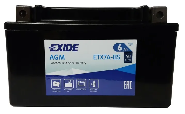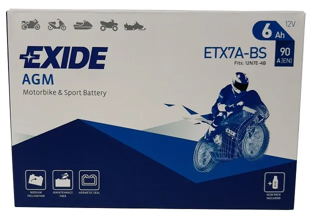 ZALETY akumulatora EXIDE ETX7A-BS/YTX7A-BS: 1. Wysoka moc rozruchowa, odporność na wstrząsy, wydłużony czas użytkowania, całkowicie bezobsługowy, 2. Zaprojektowany dla szerokiej gamy pojazdów m.in. motocykli, skuterów, quadów, skuterów wodnych i śnieżnych, małych traktorów czy kosiarek do strzyżenia trawy, 3. Przystosowany do pracy w każdych warunkach, w różnych pozycjach, oraz do sezonowego użytkowania.