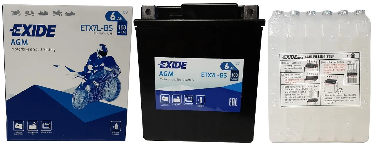W skład zestawu ETX7L-BS/YTX7L-BS wchodzi: - akumulator EXIDE ETX7L-BS/YTX7L-BS - pojemnik z elektrolitem - instrukcja obsługi i zalania - komplet śrub