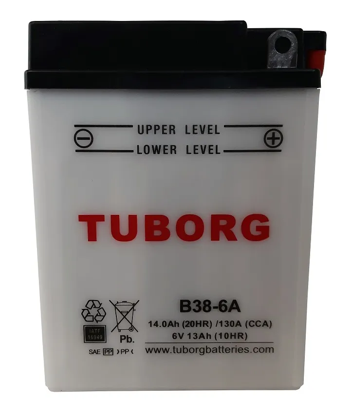 Tuborg B38-6A został wyprodukowany w tradycyjnej technologii suchoładowanej, dlatego można taki akumulator magazynować znacznie dłużej niż zwykłe akumulatory zalewane kwasem. Akumulatory tego typu są już naładowane w fabryce a pierwsze uruchomienie należy wykonać samemu zalewając akumulator elektrolitem który dołączony jest do zestawu. Czynność tą wykonujemy przed pierwszym uruchomieniem akumulatora.