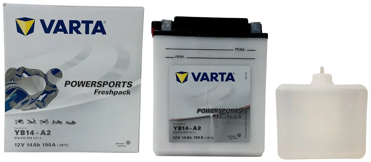 W zestawie z akumulatorem konwencjonalnym YB14-A2 otrzymujemy oryginalnie zapakowany elektrolit a jego pierwsze uruchomienie następuje dopiero po zalaniu go elektrolitem. Pełne swoje właściwości i długą żywotność uzyskuje on dopiero w ciągu ok.30 minut od momentu tzw. aktywacji (czyli zalania). Taki akumulator jest naładowany w ok 80% dlatego należy go jeszcze doładować z użyciem ładowarki automatycznej żeby uniknąć przeładowania.